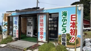 鹿児島県垂水市の国道220号沿いに設置された、日本初の海ぶどう自販機をレポート。テレビ朝日「ナニコレ珍百景」にも登場した話題のスポットで、桜島を一望しながら鮮度抜群の海ぶどう(1,000円)やヒラメを24時間購入できます。運営する森水産のフードロスへの取り組みも必見です。