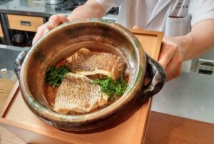 ランチでは季節の小鉢や焼き物を中心に、より軽やかな構成で楽しめる。夜は、旬の食材を駆使した本格懐石が味わえる。どちらを選んでも、最後には名物「真鯛の炊き込みご飯」が待っていますよ。