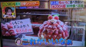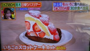 ヒルナンデス!1万円台日帰りバスツアーinいちご王国・栃木」という内容。1万円台というのは、1万2980円。この値段のなかに、いちご狩りの料金も含まれているとか。