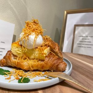 サクサクのクロワッサンに、チーズケーキが“まるごと”鎮座。そこへバニラアイス、さらに仕上げに目の前で削ってかけてもらえるチーズまで重なる、情報量多めのスイーツです。