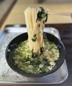 宮崎の“釜揚げ文化”を語るなら外せない老舗。メニューの軸は釜揚げで、茹でたての麺を湯だまりのまま、つけ汁で食べるスタイルが魅力です。麺はやさしい口当たりで、食べ進めるほどに小麦の甘さが立ち、つけ汁の香りと合わさってスッと胃に入る感じ。「コシで殴る」ではなく「温度と香りで包む」釜揚げなので、讃岐の冷たい締め麺に慣れている人ほど新鮮に感じます。観光の昼ごはんにも、宮崎うどんの入門にもぴったり。