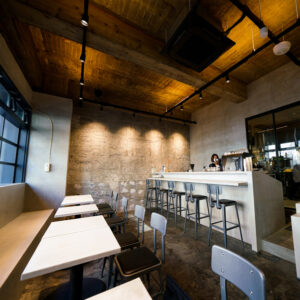 店内はコンクリート打ちっぱなしの壁が特徴的な、無機質でありながら洗練された空間です。2人用テーブル席のほかにカウンター席も設けられており、24席を擁します。静かでスタイリッシュな雰囲気の中、ゆっくりとスイーツを楽しめます。